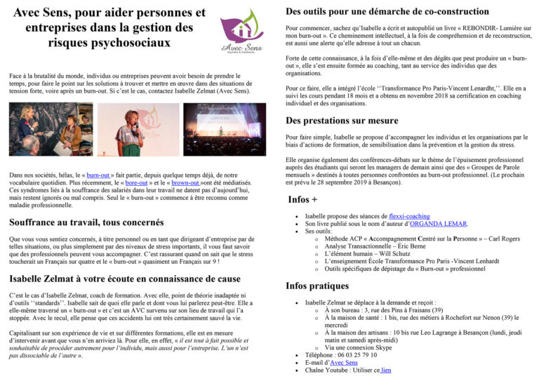 Face à la brutalité du monde, individus ou entreprises peuvent avoir besoin de prendre le temps, pour faire le point sur les solutions à trouver et mettre en œuvre dans des situations de tension forte, voire après un burn-out. Si c’est le cas, contactez Isabelle Zelmat (Avec Sens).